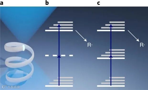 两步吸收的第二步:图3中的浅蓝色箭头将电子从T1态带到激发三重态Tn,由此产生自由基(R·),从而开始聚合反应。在适当条件下,两步吸收具有与双光子吸收相同的二次光学非线性,即曝光剂量与光强的平方成正比。
