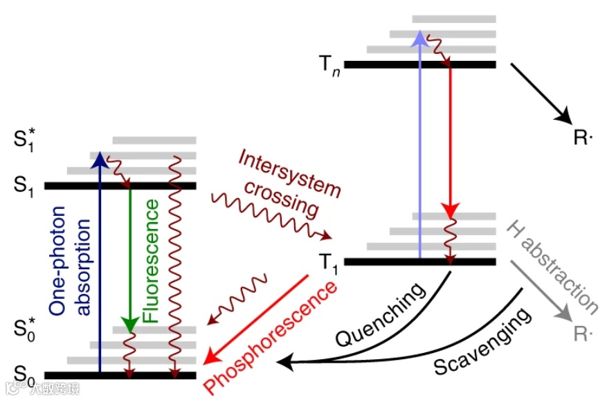 两步吸收的第一步:光引发剂苯偶酰(Benzil)经过单光子吸收后达到真实中间能级,并由两个附近的单重态S1和三重态T1所取代。系间窜越(Intersystem crossing)(名词解释>)可以在几纳秒内将电子从S1态带到T1态。抑制剂BTPOS清除了T1态引发的非必要反应。