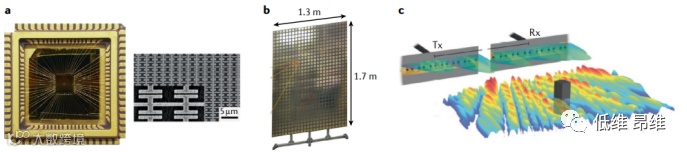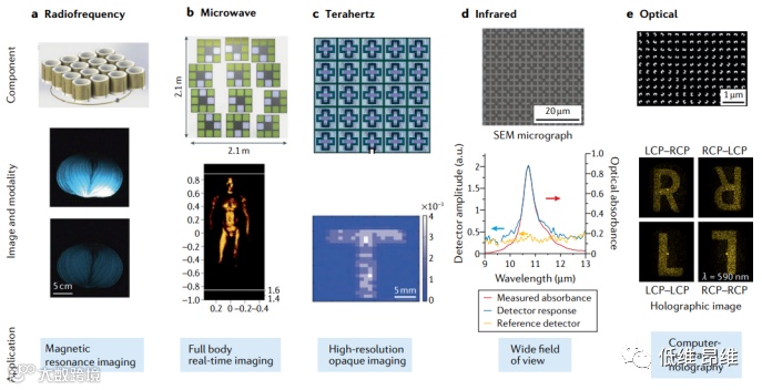 如图1所示,文章重点介绍这个领域中的几个典型例子。例如,正在开发射频超材料以提高磁共振成像(MRI)的速度和分辨率。在微波范围内,现有元件的巨大库和超材料的相对容易制造推动了基于编码孔径成像和压缩传感的应用(图1b)。基于超材料组件的太赫兹(THz)辐射成像可以用于进行化学鉴定的高分辨率成像(图1c)。在中红外(IR)波段下,超材料设备可实现编码孔径单像素成像,从而以大幅降低的成本实现更快的热成像(图1d)。在近红外波段,超材料全息图已经被证明是一条可行的路径。在可见频率下,超材料也产生了影响,例如致密金属(图1e)。