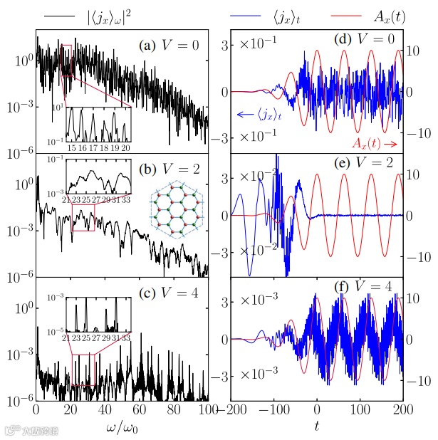 图2. 二维Haldane-Hubbard模型中不同相互作用参数V下的高次谐波谱(左列)和其对应的电流含时变化图(右列)