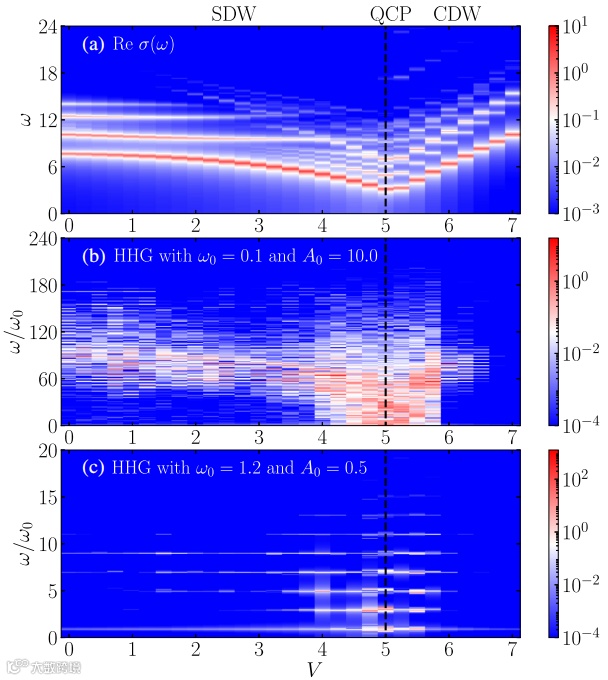 图1. 一维扩展Hubbard模型中光电导谱(上图)和高次谐波谱(中图、下图)