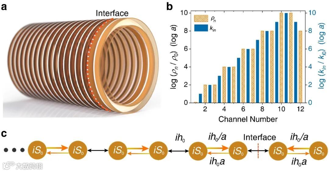 图2. 热漏斗模型。a 多环耦合结构实现拓扑热漏斗,其中红虚线表示界面。b 圆环密度和环间耦合层导热系数分布。c 等效紧束缚模型,其中非对称耦合系数ih0a和ih0/a。