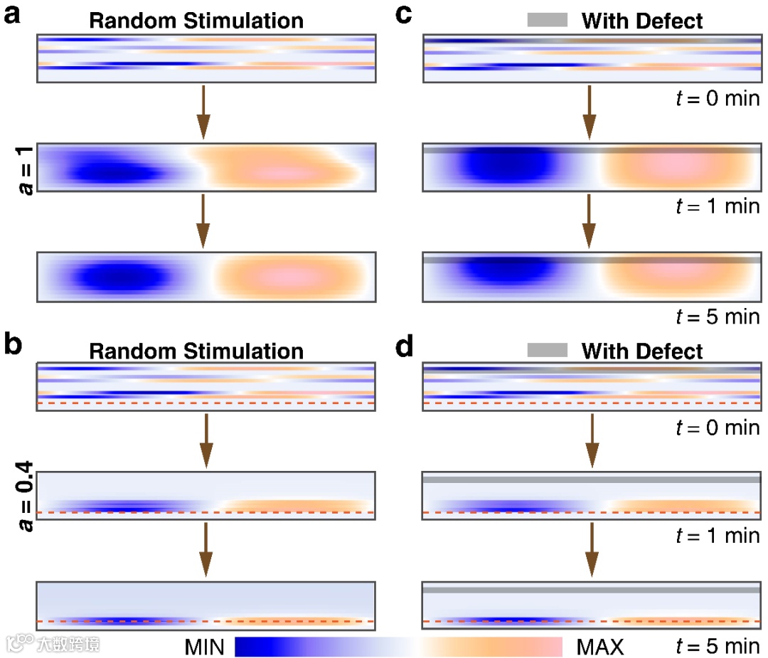 图4. 热漏斗效应。a,b 对称耦合于非对称耦合下温度场随时间演化。c,d 耦合缺陷(灰色阴影)对温度场演化的影响。相对于对称耦合,非对称耦合诱导的热漏斗效应对耦合缺陷具有较强的鲁棒性。