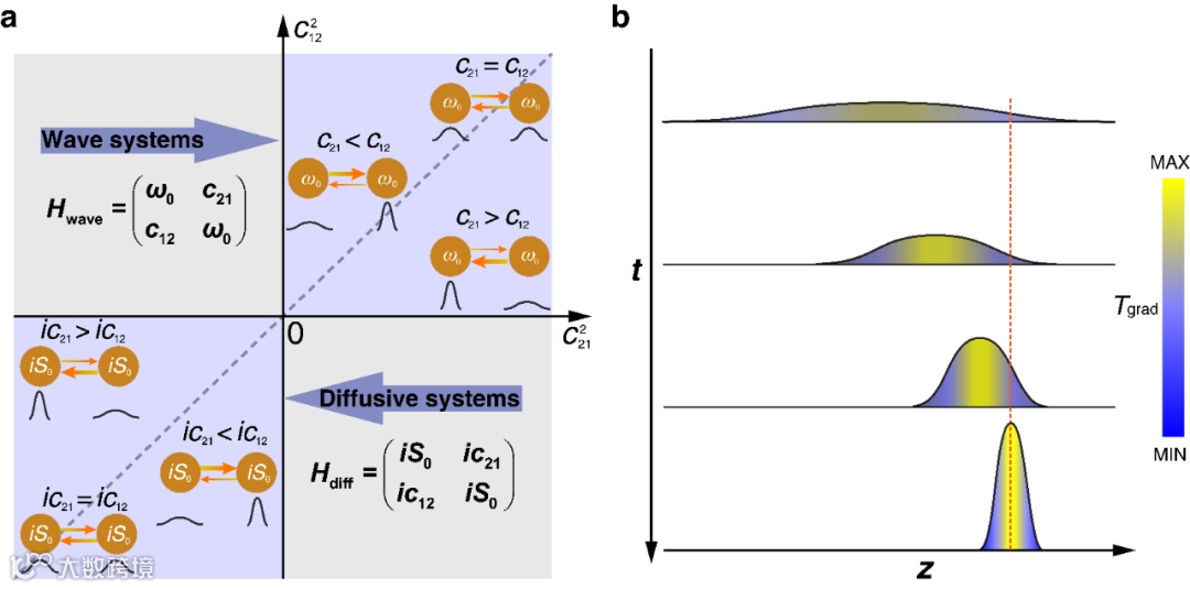 图1. 非对称耦合和热漏斗概念。a波动系统和热扩散系统中场的非对称耦合。与波动系统哈密顿量相比,热扩散系统哈密顿量中的元素均带有虚数i表示热传导过程的耗散特性。b热漏斗概念图。温度场快速聚集于指定位置并达到稳态。