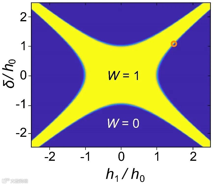 图3. 拓扑相图。黄色区域卷绕数W = 1对应拓扑非平庸态,蓝色区域卷绕数W = 0对应拓扑平庸态。