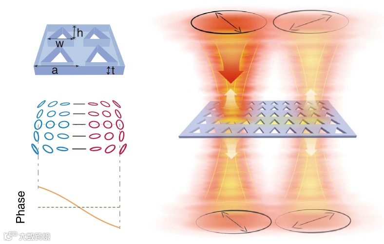 图2. 利用光子晶体引入动量空间相位梯度以及垂直入射的光束在光子晶体发生位移示意图