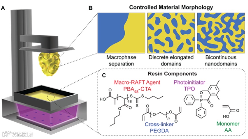 3D打印技术极大地简化了具有任意几何形状和定制化学成分材料的生产。至关重要的是,虽然直接墨水书写和立体光刻等3D打印方法能够制造具有高分辨率微观和宏观尺度特征的多材料,但在纳米尺度上对材料特性的控制仍然难以实现。已经开发了几种创新技术来减小3D打印中的特征尺寸,尤其是双光子打印,但是,这些系统是由越来越复杂和专业化的硬件驱动的。由于嵌段链段之间的热力学不相容性,嵌段共聚物自发地微相分离。由于嵌段共聚物链段是共价键连接的,因此熵恢复力限制了宏观相分离,从而提供了具有复杂形态和纳米级结构的高度有序的材料。聚合诱导微相分离(PIMS)利用可逆失活自由基聚合进行原位嵌段共聚物的形成,多官能(交联)单体的聚合允许相分离混合物的动力学阻滞。PIMS工艺允许一步形成由具有独立可调特性的不同相组成的纳米结构材料。这一显着特征允许纳米结构材料用于各种应用,包括作为纳米多孔材料、聚合物电解质膜、生物医学材料等。