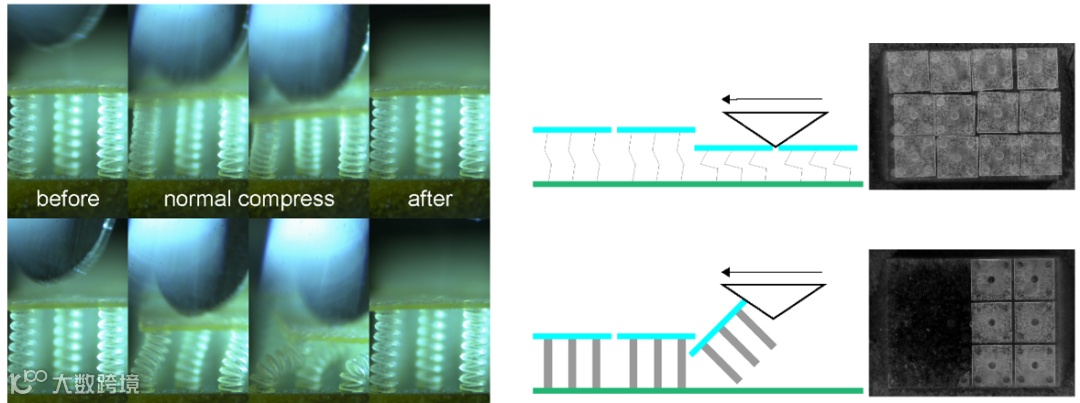 柔性蘑菇状超疏水仿生界面结构被证明可承受常规的法向挤压和水平剪切行为;在实际摩擦行为中,较刚性结构有更好的耐磨性。