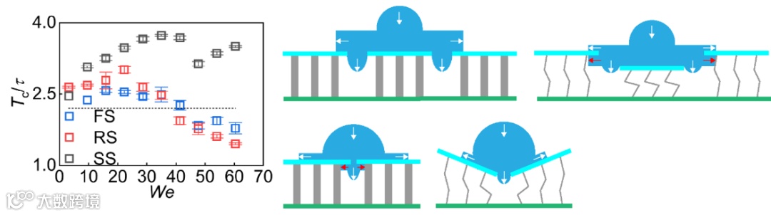 柔性蘑菇状超疏水仿生界面结构被证实可以通过触发结构振动来缩短固液接触时间。进一步,研究团队指出液滴在冲击结构自身与相邻结构间隙时存在明显差异,揭示了内在力学机理,并应用于抵抗液滴的斜向冲击。