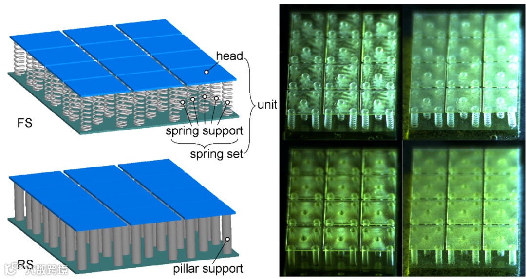 界面设计与制备(蘑菇平板阵列,宽度2800μm,厚度100μm,间隔200μm;弹簧支柱:自由高度2000μm,中径500μm,线径90μm,线圈数8个)