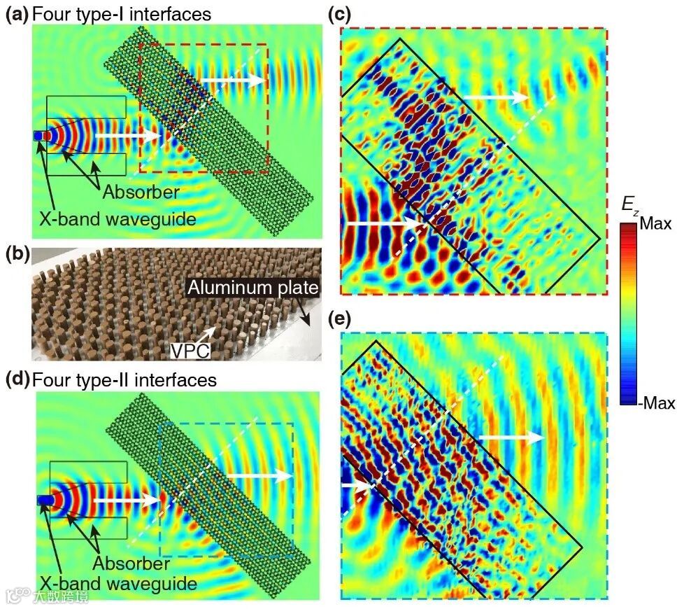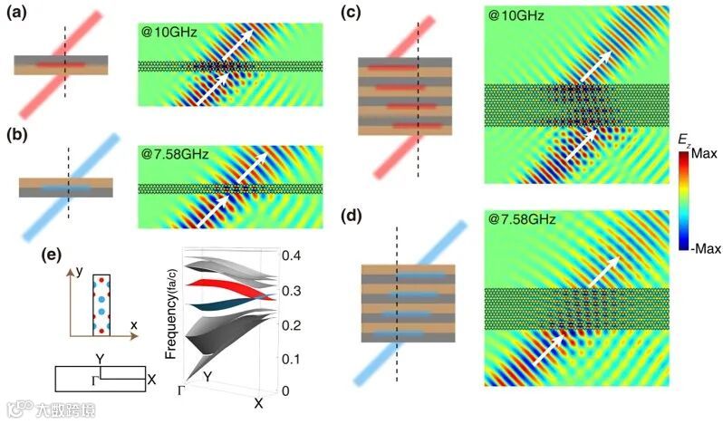 作者们利用氧化铝陶瓷柱制作了这种谷光子晶体样品并分别构造了四层堆叠的界面(如图3(b)所示)。使用一个标准的X-band波导和部分吸波材料可以产生具有一定宽度的准高斯波。随后作者们将微波源与样品置于平行金属平板波导中来模仿无限高的二维系统,并且用一个伸入平板波导中的偶极子天线来测量其中的电场分布。实验测量的结果(图3(c), 3(e))与数值仿真的结果(图3(a), 3(d))非常吻合,都显示了显著的负折射和正折射的现象。