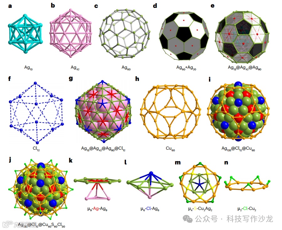本文报道了Ag135Cu60(S(CH2)2Ph)60Cl42(简称Ag135Cu60)纳米簇的合成和表征,该纳米簇包含一个类似巴克明斯特富勒烯的银核,并被铜复合物包裹。通过精确控制金属原子的排列和配体的保护,成功合成并稳定了这一具有独特拓扑结构的金属纳米簇,为研究金属纳米簇的结构与性质之间的关系提供了新的视角。