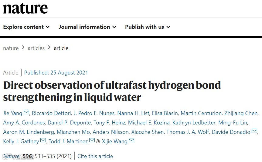 美国SLAC国家实验室的杨杰研究员(现任清华大学化学系长聘副教授)及其合作者首次直接观察到水分子中的氢原子在被激光激发时如何牵引和推动邻近的水分子。研究人员通过一束飞秒红外激光脉冲对100 nm厚的水样品进行振动激发,并利用一束飞秒兆电子伏(MeV)电子脉冲对样品进行衍射探测。每一幅衍射图直接反映出相邻水分子间的动态运动。通过控制并扫描激发激光脉冲与探测电子束脉冲的时间间隔,研究团队获得了飞秒时间尺度上丰富的结构动力学信息。结果表明在~80飞秒的时间内,氢键键长大约收缩0.04埃,随后在~1皮秒(1皮秒=10-12秒)的时间尺度上氢键再次舒张,形成了对相邻分子的“拉近-推远”的动态过程。将实验测量结果与分子动力学模拟对照,研究人员证明这一“拉近-推远”过程与经典力学相违背,而该现象完全得益于氢核量子效应。这一实验观测揭示了氢核量子效应在液态水微观动力学中的决定性作用。相关论文以“Direct observation of ultrafast hydrogen bond strengthening in liquid water”为题,发表在《Nature》.文章第一作者为美国SLAC国家实验室的杨杰博士,共同通讯作者为美国SLAC国家实验室的杨杰、Kelly J. Gaffney、Todd J. Martinez, Xijie Wang与加州大学戴维斯分校的Davide Donadio。