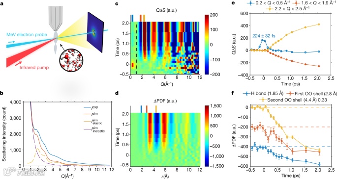 作者利用液体超快电子散射(通过超薄液体片射流与兆电子伏 (MeV) 电子束的组合实现的)技术测量了飞秒时间和原子空间分辨率的液态水中OH伸缩振动激发的超快结构响应(实验装置如图1a)。作者绘制了静态散射强度Iexp(Q)和模拟的Isim(Q)及其弹性和非弹性分量(图1b),其中Q是散射电子和入射MeV电子之间的动量传递。大多数Q >1 Å−1的特征都有慢皮秒的开启,但是低Q ( 0.2< Q< 0.5 Å−1 )特征是短寿命的,时间常数为224±32 fs(图1e)。作者使用差分散射曲线QΔS来显示散射模式的变化作为泵-探针延迟的函数(图1c)。通过QΔS曲线的傅里叶正弦变换计算得到的差对分布函数(ΔPDF)。ΔPDF中最大的特征是第二个OO配位壳的展宽,由原来第二个OO壳位置的一个漂白带(约4.4 Å)和它旁边出现两个强的正带表明。ΔPDF强度在三个主要短程距离上的时间演化为:初始氢键OH约为1.85 Å,第一OO壳约为2.8 Å,第二OO壳约为4.4 Å。