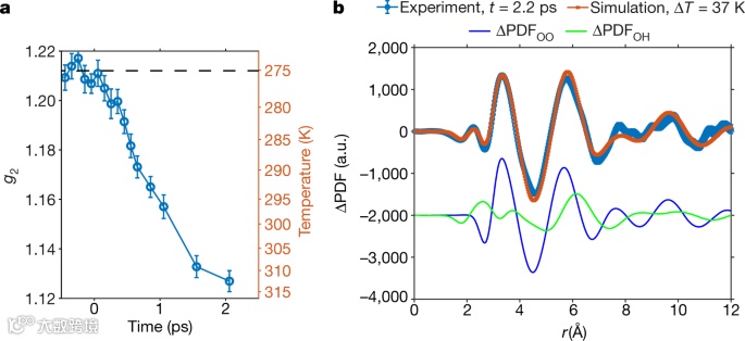 在后期延迟时间,热能化作用成为ΔPDF信号的主导源。在散射实验中,水的温度可以用径向分布函数( RDF )中第2个OO壳的峰高g2来表征(图4a)。温度在300 fs左右开始升高,在2.2 ps的观测窗口升高37.5±3.5 K,温升的时间常数约为1 ps。同时给出了2.2 ps时的实验ΔPDF,发现与两个温差为37 K的平衡水箱的模拟ΔPDF吻合较好(图4b)。本工作揭示了水中分子内振动和分子间振动之间的耦合。研究表明,拉伸模式与弯曲模式第一泛音之间的强费米共振耦合是OH拉伸弛豫的关键步骤.