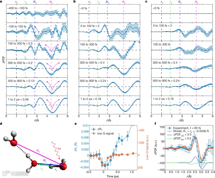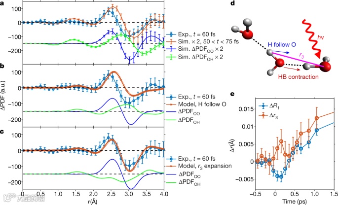 电子散射能够解析水分子中的氢原子。图3a显示了大约60 fs时的实验和模拟ΔPDF,其中模拟能够重现实验曲线的所有主要特征,但在2.7 Å左右的过零除外。作者通过额外移动r3来考虑氢原子动力学,即两个第一壳层氢原子与光激发氧原子的距离(图3d)。在图3b中作者假设第一壳层氢原子遵循母体氧原子(Δr3=ΔR1),如图3d中的球棒模型所示。作者发现用此模型预测的ΔPDF与模拟结果有一定的吻合,但与实验结果有较大的差异,表明第一壳层氢原子不是被动跟随其母体氧原子。实验结果表明,实验的ΔPDF可以通过r3扩展模型更好地再现。为了捕捉r3作为时间的函数,作者进行了双参数拟合,其中ΔR1和Δr3是两个拟合参数,Δr2设为等于ΔR1,其他所有原子对距离不变。结果表明表明实验结果与分子动力学模拟结果之间存在差异的原因微妙的分子间相互作用。作者提出,造成理论与模拟不一致的潜在原因包括:模拟中牛顿弛豫动力学缺乏量子效应,本模拟中假设局域振动激发,或者用于分析实验数据的基本对距离移动模型被击穿。