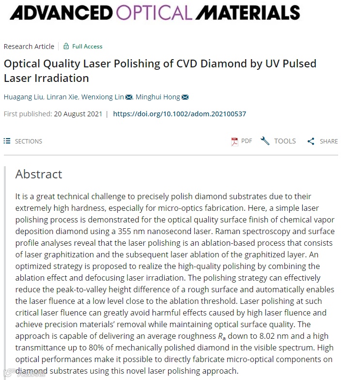 该研究成果近期以“Optical Quality Laser Polishing of CVD Diamond by UV Pulsed Laser Irradiation”为题发表在Advanced Optical Materials期刊上(Adv. Optical Mater. 2021, 2100537)