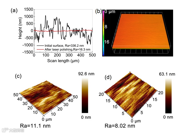 图1 激光抛光金刚石实验结果。(a)抛光前后的一维表面形貌;(b)抛光后表面共聚焦三维形貌;(c, d)二维表面粗糙度(AFM图片),50 μm×50 μm区域粗糙度11.1 nm,20 μm×20 μm区域粗糙度8.02 nm。