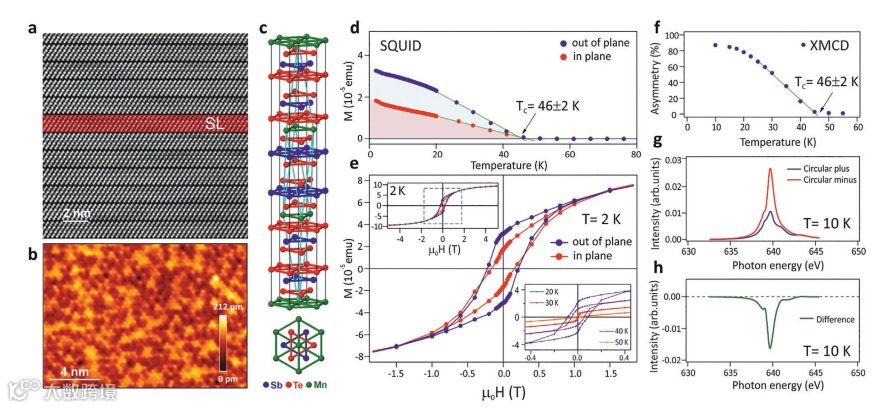 近日,柏林亥姆霍兹材料与能源中心Oliver Rader,约翰内斯开普勒大学Gunther Springholz等研究发现,之前被认为拓扑平庸的P型 MnSb2 Te 4,在锰过量了几个百分点后成为了一种铁磁拓扑绝缘体。通过使用光电子能谱和扫描隧道光谱等,证明该材料具有以下性质:(i) 居里温度为 45-50 K 的铁磁磁滞,(ii) 面外磁各向异性,(iii) 狄拉克点接近费米能级的二维狄拉克锥,iv) 面外自旋极化, (v) 在居里温度下磁感应带隙闭合。此外,发现了磁化强度 β ≈ 1 的临界指数,表明在量子临界点附近。第一性原理计算表明,Mn-Sb 位点交换提供了铁磁层间耦合,而略微过量的 Mn 几乎使居里温度翻了一倍。相关研究工作发表在《Advanced Materials》上。(周玉宇)