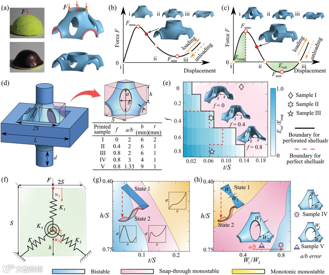 近日,加拿大麦吉尔大学Abdolhamid Akbarzadeh团队通过在Schwarz's Primitive (P)壳体表面引入精细的孔洞,开发了一种新的3D多稳态壳体超构材料,将壳体材料的独特特性(如高表面积、刚度和能量吸收)与多稳定性概念结合。利用两种穿孔策略:1)垂直椭圆孔(作为双稳态模式)和2)交错水平矩形孔(作为多稳态模式)。通过设计P壳体的几何参数和选定的穿孔轮廓,展示了如何在具有椭圆孔的P壳体图案中实现双稳态,而交错穿孔可导致双/三/四/多稳定图案。通过数值模拟、弹簧理论建模和力学试验验证了多孔P壳体超构材料的结构多稳定性。采用n层交错穿孔(n铰链)设计可在加载和卸载过程中在一个壳状图案内产生最多2n-1个稳态。通过在三个正交方向上扩展穿孔设计来获得三向多稳态壳体。引入的弹跳突变和快速回弹特性以及自接触行为,多稳态穿孔壳体在加载和卸载时都表现出很强的刚性,并增强了能量耗散。引入的设计策略为创建具有承载能力的多向多稳态超构材料开辟了新视野,适用于软体机器人、形状变形架构以及可重复使用和可展开的能量吸收器/阻尼器。相关研究发表在《Advanced Materials》上。(徐锐)