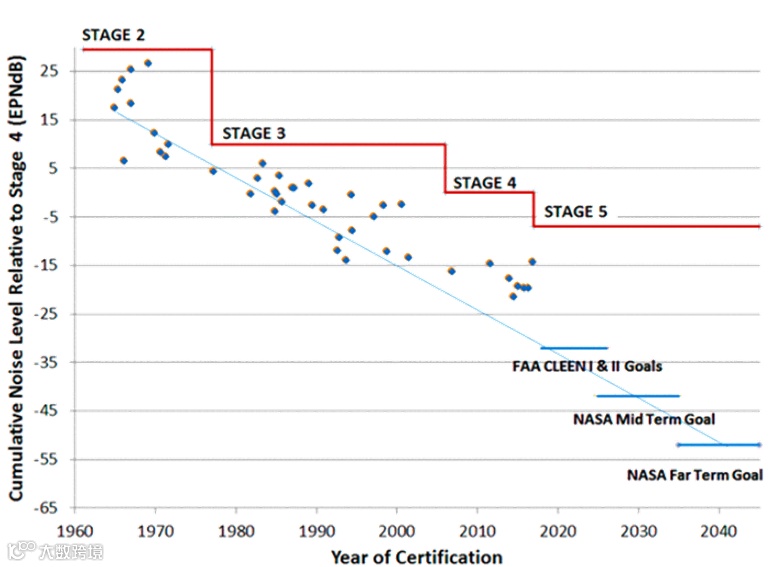 运输机根据噪声等级进行合格审定,当前是第5阶段。[6]现代喷气式飞机在三个单独的合格审定测量位置(在飞机进场时正下方,起飞时在飞机正下方以及侧面)的平均测量EPNL降低了大约15 dB。与第一代喷气式飞机相比,波音727和道格拉斯DC8相应的认证EPNL累积减少为40–50 dB,表示三个测量位置的声级累积减少。图2显示了多年来取得的进展,以及FAA和NASA进一步降低噪音的目标。
