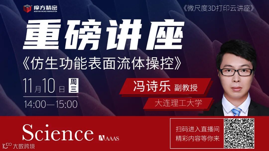 微尺度3D打印云讲座又回来啦!本次我们很荣幸邀请到了刚刚在国际顶级期刊《Science》上发表了题为“仿南洋杉3D毛细锯齿结构表面流体自主择向”的论文作者之一大连理工大学冯诗乐副教授给我们带来重磅讲座。