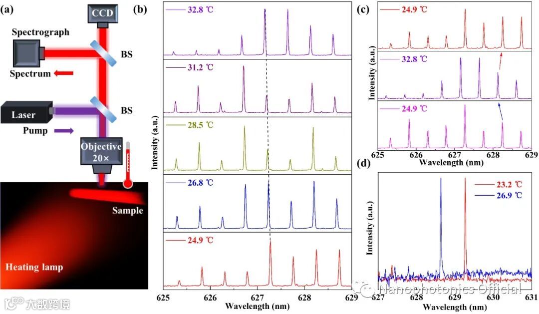 研究人员利用聚合物材料对温度响应特性,提供了通过外界温度控制聚合物光纤出射波长的可行方法。增益材料随着温度升高,有效折射率降低,从而观察到激光谱线蓝移的现象,实验结果和理论预期吻合良好,且能够恢复到初始状状态,证明该温度传感器具有良好的重复性。在2D-3D hybrid μ-cavity中,单模激光器的激光谱线随着温度升高发生了蓝移现象,这与预期保持一致(见图3)。