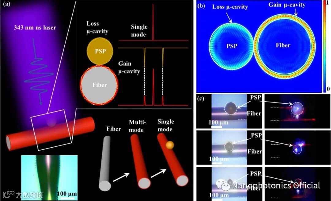 近日,北京工业大学翟天瑞教授团队在Nanophotonics期刊发表最新文章,设计出一种基于二维和三维复合的耦合腔(2D-3D hybrid μ-cavity),通过泵浦控制实现了全色单模激光器。该耦合腔结构由聚合物光纤(Polymer fiber)和聚苯乙烯微球(PSP)组成,聚合物光纤作为优良的主动腔(Gain μ-cavity)能够产生多模回音壁激光,而聚苯乙烯微球作为被动腔(Filter μ-cavity)提供了损耗通道,能够抑制大多数激光模式,当增益腔的激光模式被抑制,只有一个共振模式存在于耦合腔时,能够得到单模激光器(见图1)。团队在数值模拟仿真的基础上分析了共振腔的模式选择机制,为实现单模激光器提供了理论基础。实验结果与理论预期非常吻合,据此制备了多色耦合腔,充分证明了该方法能够简单有效地实现全色单模激光器。