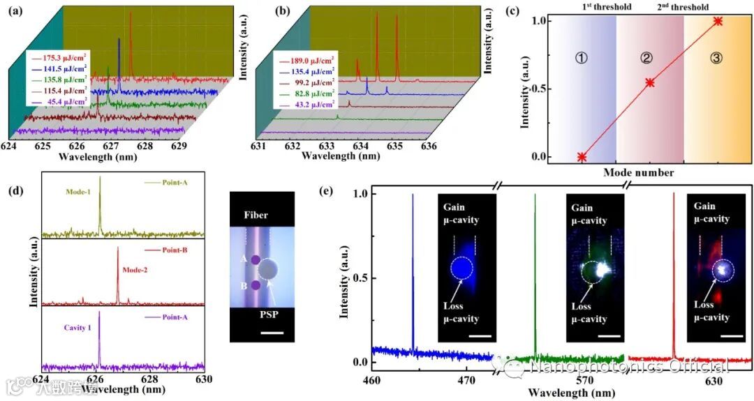 北京工业大学翟天瑞教授团队基于滤波效应提出了微腔耦合的模式选择机制,设计了一种制备工艺简单的2D-3D hybrid μ-cavity实现了全色单模激光器。聚合物光纤表面比较光滑,可以作为性能优良的增益腔,从而实现多模回音壁激光器;PSP提供损耗通道可以抑制绝大部分激光模式输出,最终只有一个共振模式存在于耦合腔中,得到单模激光器。另外,通过不断增加2D-3D hybrid μ-cavity的泵浦能量密度,得到了多模激光器的。理论和实验结果表明,该方法能够有效的调节回音壁激光出射模式(见图2)。