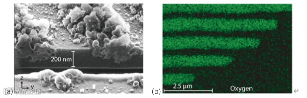 图3. (a)利用聚焦离子束切开纳米光栅观察其剖面图。(b)利用能量色散X射线光谱仪分析纳米光栅中的氧元素分布。