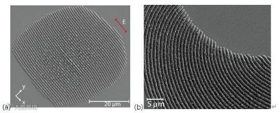 图2. 单束(a)线偏振和(b)矢量飞秒激光在硅薄膜上诱导产生的纳米光栅扫描电镜图。