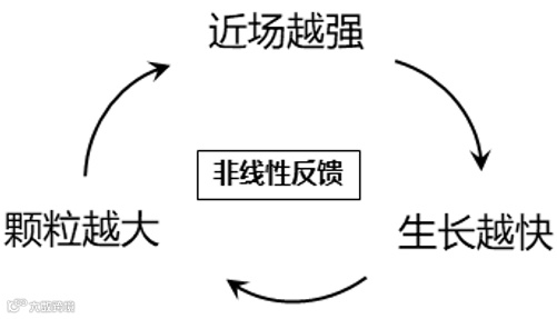 当然,激光作用初始阶段,会形成大量随机的氧化物纳米颗粒。但是,尺寸越大的颗粒,其近场增强越强,从而导致颗粒生长越快,形成一个正反馈过程,如图6所示。研究人员将这个正反馈称为光场局域导致的非线性竞争效应(Optical localization-inducednonlinear competition, O-LINC),该效应可确保在很大的光斑范围内,只有一个纳米颗粒作为有效的种子诱导形成周期性结构。