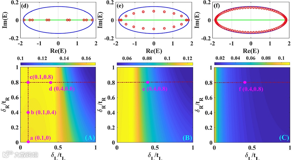 图: (A) -(C) 边界参数空间不同尺寸下非厄米Hatona-Nelson模型的波函数的平均IPR(Inverse participation ratio)变化的对比。(A) (B) (C)分别对应系统格点数目为N=10,20,80,其中(0,0)和(1,1)分别对应开边界和周期边界。IPR的大小反映了归一化波函数的空间分布的局域或扩展程度。蓝色标记的区域接近扩展态,黄色标记的区域接近趋肤态。(d) (e) (f) 表示同一参数不同尺寸下系统的能谱 (分别对应(A) (B) (C)图中的d,e,f点)。随系统尺寸增加,系统的本征值从落在开边界谱域的全实谱逐渐演化为接近周期边界复能谱的分布。能谱随系统尺寸的变化也展示了尺寸依赖的非厄米趋肤效应的存在。当系统尺寸趋于无穷大极限时,只有参数空间坐标轴Y轴(或X轴)上才可能存在稳定的非厄米趋肤态。