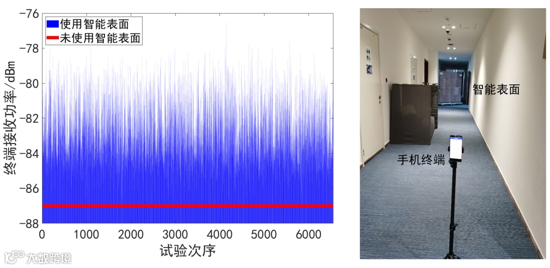 图2 左图:智能表面应用于室内场景,改善5G信号覆盖试验结果;右图:室内测试实景