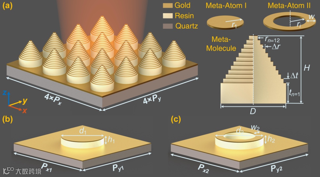 近日,西安交通大学张留洋教授课题组提出了一种偏振不敏感的超宽带太赫兹吸波器设计及其制备方法,该超宽带吸波器由叠堆于类宝塔基底表面的多层环形谐振器构成,通过相邻谐振器共振模式的重叠实现带宽的扩展,最终通过叠堆12层圆形和环形谐振器实现1.07-2.88 THz频段的近完美吸收。该研究结合微尺度3D打印技术(nanoArch S130,摩方精密)制备得到实验样件,实验测试结果验证了宽带吸收机理的准确性。该成果以“Three-Dimensional Printed Ultrabroadband Terahertz Metamaterial Absorbers”为题发表于国际期刊Physical Review Applied上,该研究工作由西安交通大学机械工程学院博士生沈忠磊与硕士生李胜男共同合作完成。