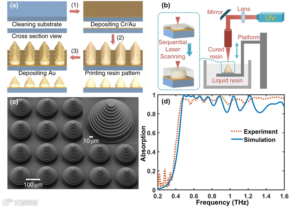 通过结合微尺度3D打印技术,超宽带太赫兹吸波器可由简单的三步工艺制备得到。其中,周期性阵列的三维类宝塔结构采用面投影微立体光刻3D打印技术(nanoArch S130,摩方精密)加工得到。实验结果表明:得益于高精度的微尺度3D打印技术,测试所得的宽带吸收谱谐振频率和吸收幅值均与数值模拟结果较为吻合。