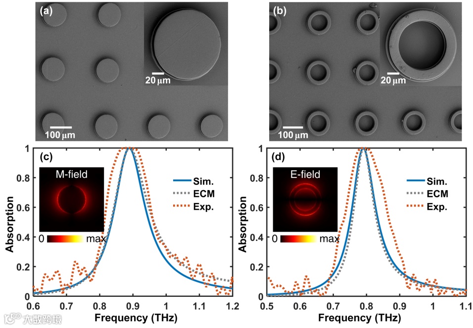 此外,文章进一步证明了该制备方法之于常见太赫兹窄带吸波器制备的适用性。实验结果表明:两种太赫兹窄带吸波器的吸收谱测试结果与数值模拟结果和理论结果均较为吻合,表明基于微尺度3D打印技术的制备方法同样可实现对常见太赫兹窄带吸波器的高质量制备。