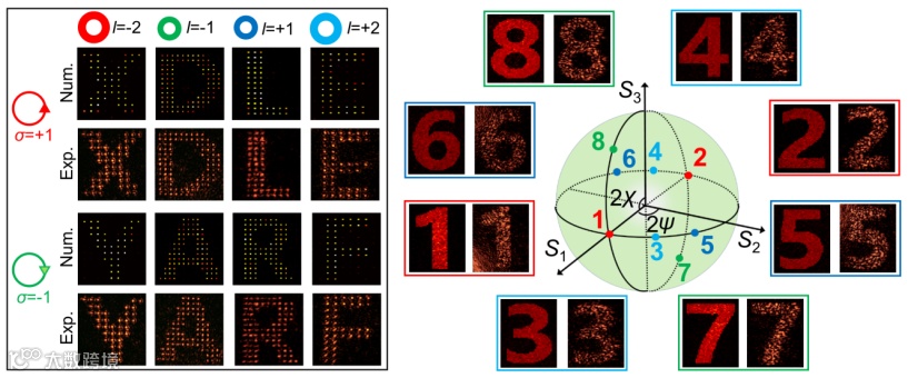 基于上述原理,研究团队在理论和实验上展示了具有16个独立通道的角动量全息(见图2)。作为原理的验证,此处展示了分别具有8个独立通道的自旋轨道锁定全息和自旋叠加全息,两种全息在理论上都具有无限的复用通道数。