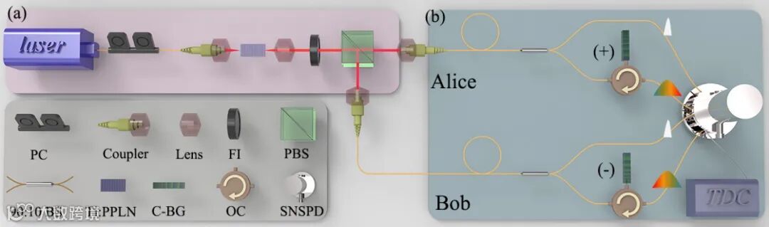 图2.源无关的量子随机数发生器的实验装置。(a)纠缠源,(b)测量设备。