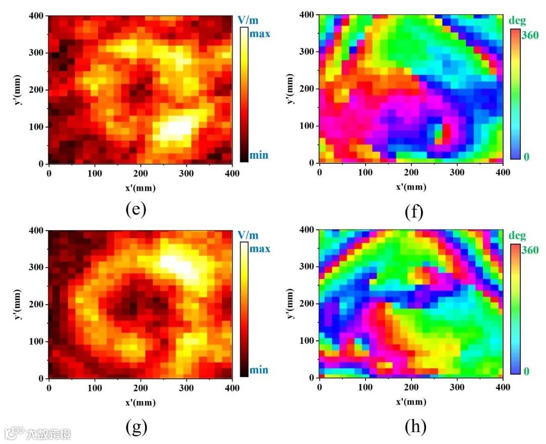 图4. 透射编码超构表面样品在微波暗室中的(a)远场和(b)近场测试的实验设置图。(c)φ=45°和(d)φ=135°平面上的远场测量和仿真结果对比图。+1模态波束的近场测量结果(e)电场强度分布和(f)相位分布;-2模态波束的近场测量结果(g)电场强度分布和(h)相位分布