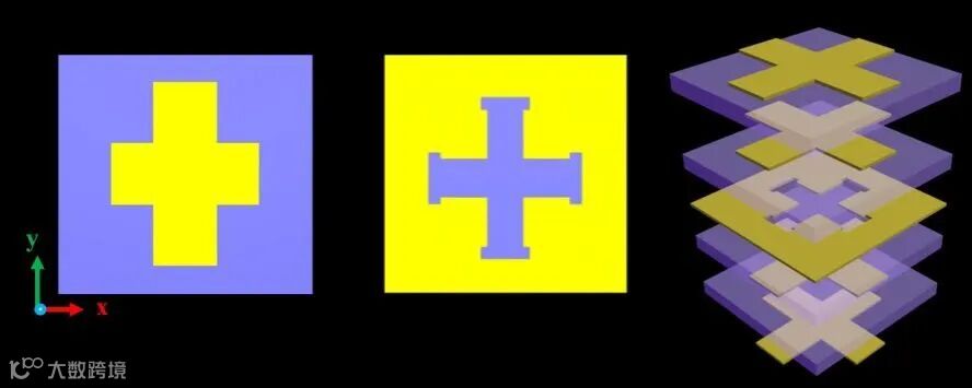 鉴于此,研究团队基于前期的研究工作,提出了一种极化独立的单馈源透射数字编码超构表面来产生双模态四波束 OAM,如图1所示。通过对 x 和 y 两个相互正交的方向进行数字编码,设计了两款透射超构表面M1和M2,分别实现了不同方向的具有两种模态的四波束OAM。该研究引入了四层介质基板和五层金属结构的交叉偶极子金属结构,设计出对应的单元如图 2(a)所示。根据传输相位原理可知,当改变交叉偶极子金属结构其可产生电磁谐振,调控透射相位。根据上述结构设计出包含64种状态的3bit编码单元,其结构如图2(b)所示。该单元在10.5-11.5GHz频段内其透射系数均大于0.8且编码单元相位随着金属贴片尺寸的变化呈现出梯度的分布,结果如图2(c)所示。