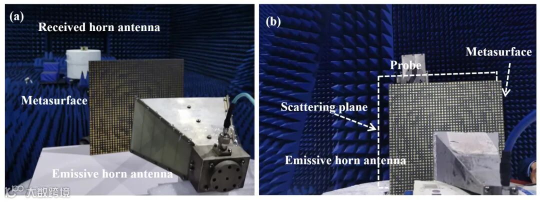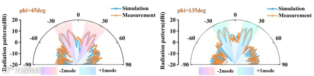 最后,该研究制作了透射编码超构表面样品,并在微波暗室中完成了远场和近场的实验测试(如图4)。可以看到TCMS样品能够有效实现双模态四波束OAM。经过对比,测试结果与仿真结果基本保持一致,验证了该设计方案的可行性。