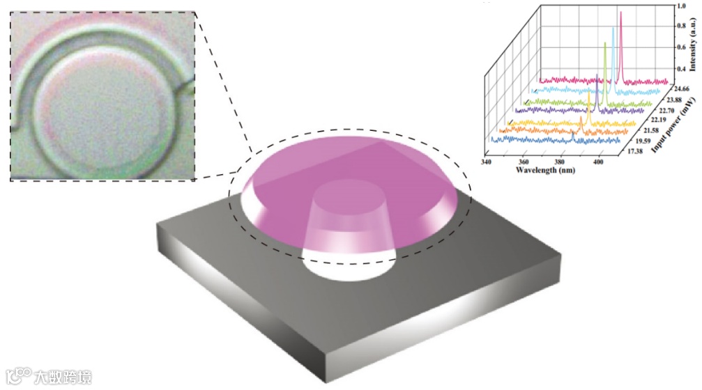 有效的倍频需要同时满足能量守恒和动量守恒,本研究中使用了有限元方法(FEM)来计算相位匹配条件。工艺制造上利用聚焦离子束(FIB)对直径为50 μm的微盘进行研磨,然后进行化学机械抛光(CMP),使微盘腔表面和边缘光滑,在可见光波段的品质因子达到2.74×105,实现了波长为384.3 nm的片上紫外倍频相干光,归一化转换效率为5.74×10-6/W。研究人员认为,通过优化泵浦波长、功率和相位匹配条件,可以获得中波紫外线(UV-B,280~320 nm),通过进一步优化结构和实验方案,可以实现更高的效率。