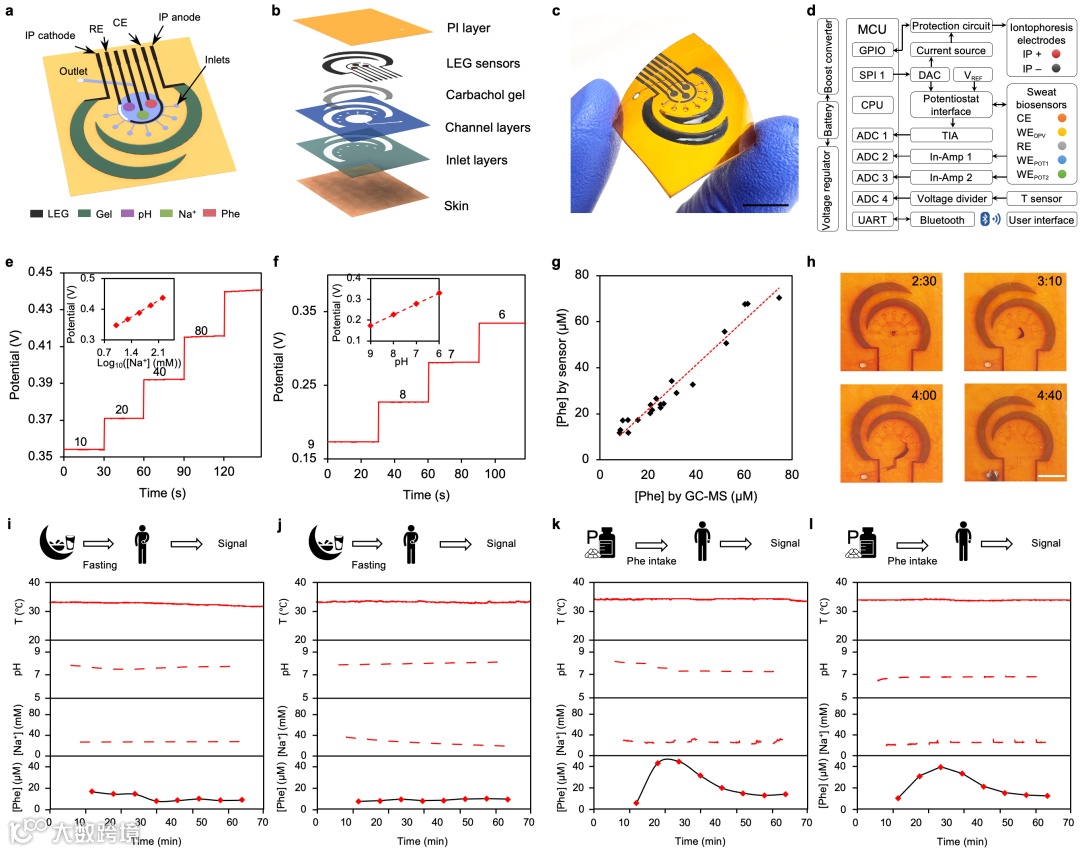 最终,为了实现汗液中苯丙氨酸原位、连续、快速识别,设计了汗液按需刺激分泌系统、汗液收集微流道系统、全集成小型化数据采集及接收系统、汗液传感器分析系统,并将以上单元通过工程学设计,构筑了可穿戴的微型化汗液中苯丙氨酸分析设备的廉价构筑,并且实现了人体汗液中苯丙氨酸的原位监测(图5)。