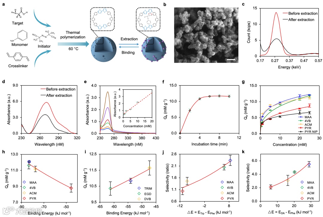 作者从苯丙氨酸分子选择性识别出发,先后通过分子数据库生成-上百中分子对接可能性-氢键对接方式-最终指导基态连接方式,实现最优化单体、交联剂、单体与模板分子比例、合成溶剂等参数的自动化优化。