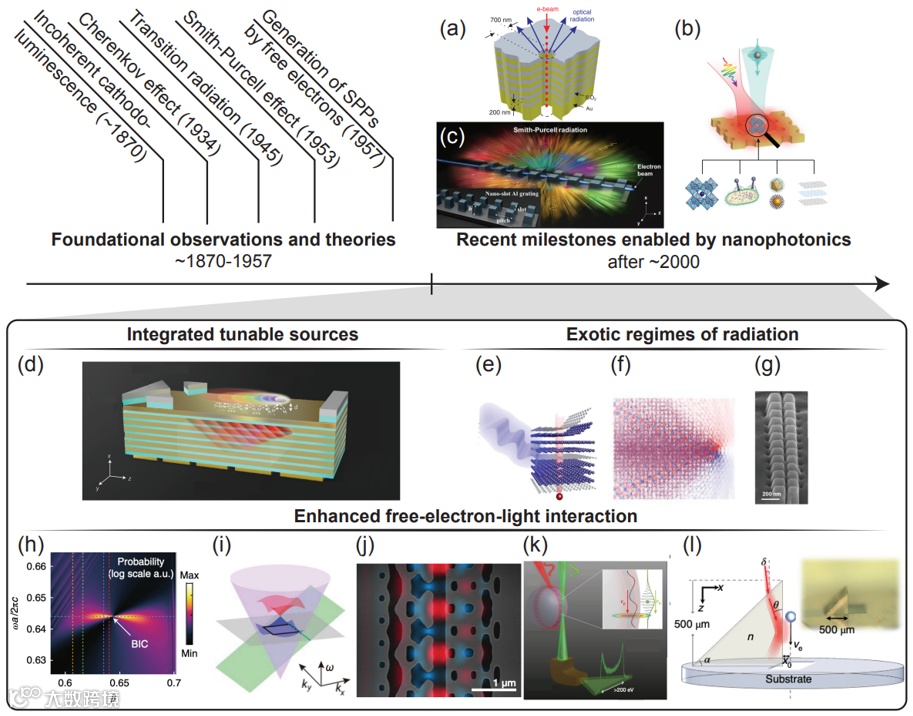 这个领域深刻揭示了自由电子可以在各种条件下将其能量转化为光子的现象。在过去的二十年中,纳米光子学已经成为一种新型物理平台,可以通过在材料上进行与光子波长相当的尺度的结构设计来控制纳米尺度上的光子模式。
