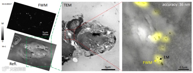 图2显示了CLEM系统的相关精度分析结果。图片是将变换后的FWM场振幅(黄色)和透射电镜(TEM)图像(灰色)的叠加形成的,获得的相关精度为54纳米。