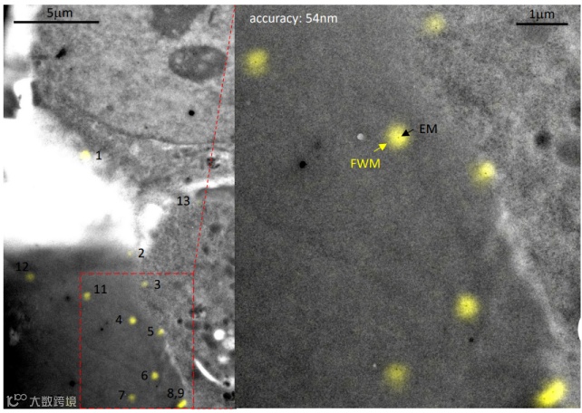 图3展示了在HeLa细胞中使用半径为5纳米AuNP进行的CLEM成像示例。结果表明,这种小尺寸的单个纳米颗粒可以被清晰地分辨出来,不受噪声和背景的影响,获得的相关精度为58纳米。
