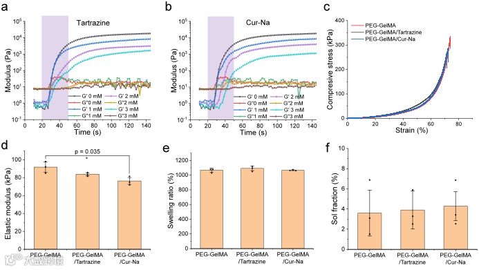 图2. 生物墨水的物化性质。添加了不同浓度光抑制剂的生物墨水(PEG-GelMA/LAP)的储能模量(G'反映材料的刚度)和损失模量(G''反映材料粘度)随时间的变化:a.柠檬黄和b. Cur-Na。G'和G'之间的交叉点被称为凝胶点,而凝胶时间被定义为曝光开始至凝胶点的时间(在该研究中约为20秒)。生物墨水在405nm、13mW cm−2的光照下曝光30s。阴影区域表示曝光时间。c. 水凝胶的应力-应变曲线。d. 三种水凝胶在~20%应变下的弹性模量。三种生物墨水的e. 溶胀比和f. 溶胶分数对比。