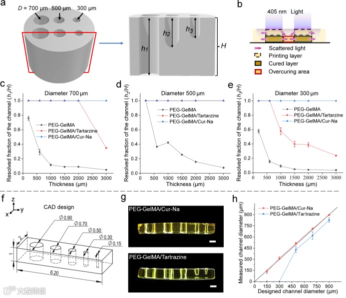 图5. 多层打印中的中空通道打印性分析与评定高保真度的打印误差分析。a. 具有不同直径(D=300、500和700μm)通道的圆柱体的3D CAD设计。H表示圆柱体的高度,而h1、h2和h3是通道的中空部分。打印精度定义为中空部分与通道总长度之间的比率。b. 连续层打印中的散射效应及其引起的过固化现象。c-e. 打印精度随圆柱体直径的高度和通道直径的关系。f. 具有不同直径的多通道结构CAD设计。g. 分别使用含Cur-Na和柠檬黄的生物墨水打印的样品。h. 通道的实际直径与设计直径间的差异。